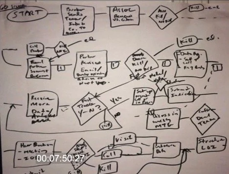It was a mess — and even the mess was optimistic! In reality, we had a dozen different processes, which changed depending on everything but the weather: where the deal came in, who had time to handle it, and a partner’s unique deal process that day might all impact what happened next. But reconciling multiple approaches is a key part of process-mapping. You’re figuring out the best version and getting everyone aligned around it. We spent half a day moving around Post-it notes, and eventually ended up with a rectangle for each activity, a diamond for each decision, and flow lines for each “yes” and “no” decision.